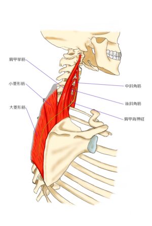 肩甲骨を支える「肩甲挙筋」「菱形筋」といった重要な筋肉の間を通っており、姿勢の悪さや筋肉のこわばりに非常に影響を受けやすい構造をしています。